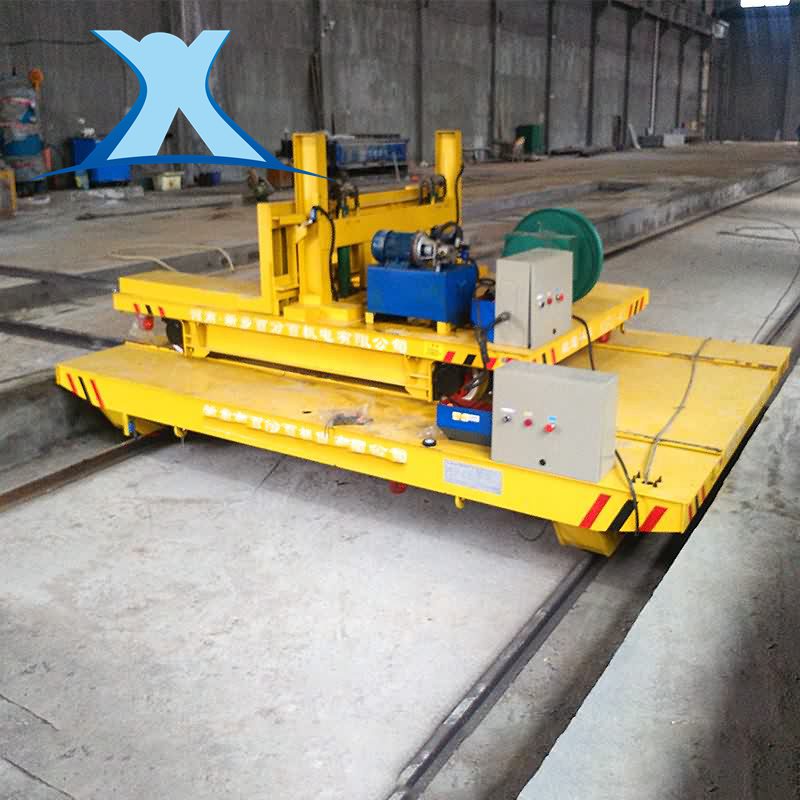 這些軌道之間并沒有交叉連接,都是平行的軌道,那怎么實現小車上工件在不同工位之間的工件的運輸的呢?在這個時候,電動軌道過跨車橫空出世,在軌道之間橫向運輸,在軌道車的臺面鋪設軌道,能夠在不同的軌道間來回地行走,在軌道的地方進行精準對軌,裝有工件的電動小車行駛到過跨車上,由電動軌道過跨車將小車連同工件一起運到另一個平行軌道上,來進行軌道間工件的換軌操作。軌道上裝有定位裝置,可實現不同軌道間軌道的精準對接和軌道間的平車的換軌操作。電動軌道過跨車采用先進的PLC控制系統,實現數字化無人操作,已經悄無聲息的闖進了自動化的生產車間。